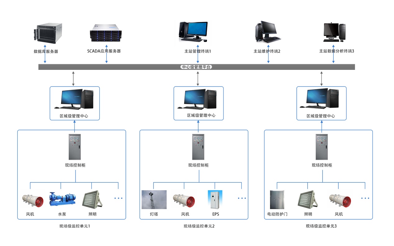 公共防災(zāi)救援設(shè)備監(jiān)控系統(tǒng)采用多層分級結(jié)構(gòu),自上而下劃分為中心級管理平臺、區(qū)域級管理中心和現(xiàn)場級監(jiān)控單元。其中現(xiàn)場級監(jiān)控單元包括水泵,風(fēng)機,照明,電動防護門,燈塔,EPS等現(xiàn)場設(shè)備以及負責(zé)現(xiàn)場設(shè)備監(jiān)控的現(xiàn)場控制柜。